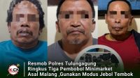 Tulungagung || kolocokronews Rabu (15/4/2026) – Kasus pembobolan minimarket di wilayah Tulungagung akhirnya berhasil diungkap aparat kepolisian. Tim Resmob Macan Agung Satreskrim Polres Tulungagung menangkap tiga pelaku yang diketahui berasal dari Malang setelah diduga terlibat dalam aksi pencurian di dua gerai minimarket dengan modus menjebol tembok bangunan. Ketiga tersangka yang berhasil diamankan masing-masing berinisial GI…
