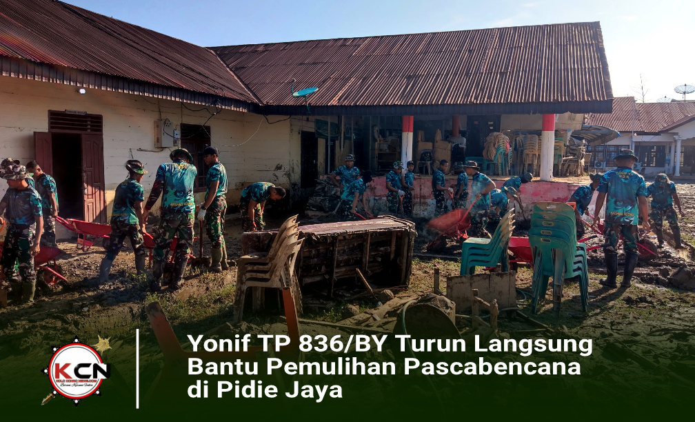 — Prajurit Yonif TP 836/BY di bawah komando Komandan Batalyon Letkol Inf Faishal Riza bergerak cepat membantu penanggulangan bencana alam yang melanda Kabupaten Pidie Jaya, Aceh. Aksi kemanusiaan tersebut difokuskan pada pembersihan sejumlah fasilitas umum yang terdampak, seperti sekolah, masjid, dan balai desa, Senin (5/1/2026).
