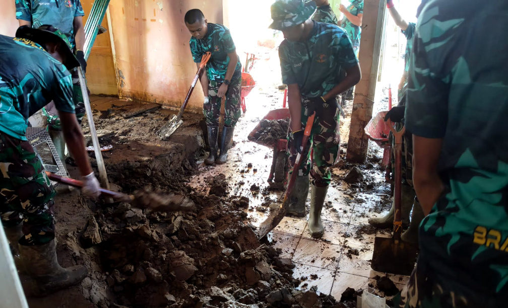 Dipimpin langsung oleh Danyon, para prajurit Yonif TP 836/BY bahu-membahu bersama warga membersihkan lumpur, sampah, serta sisa material bencana yang menumpuk di area fasilitas umum. Semangat gotong royong tampak kuat, dengan antusiasme warga yang menyambut positif kehadiran TNI di tengah mereka.